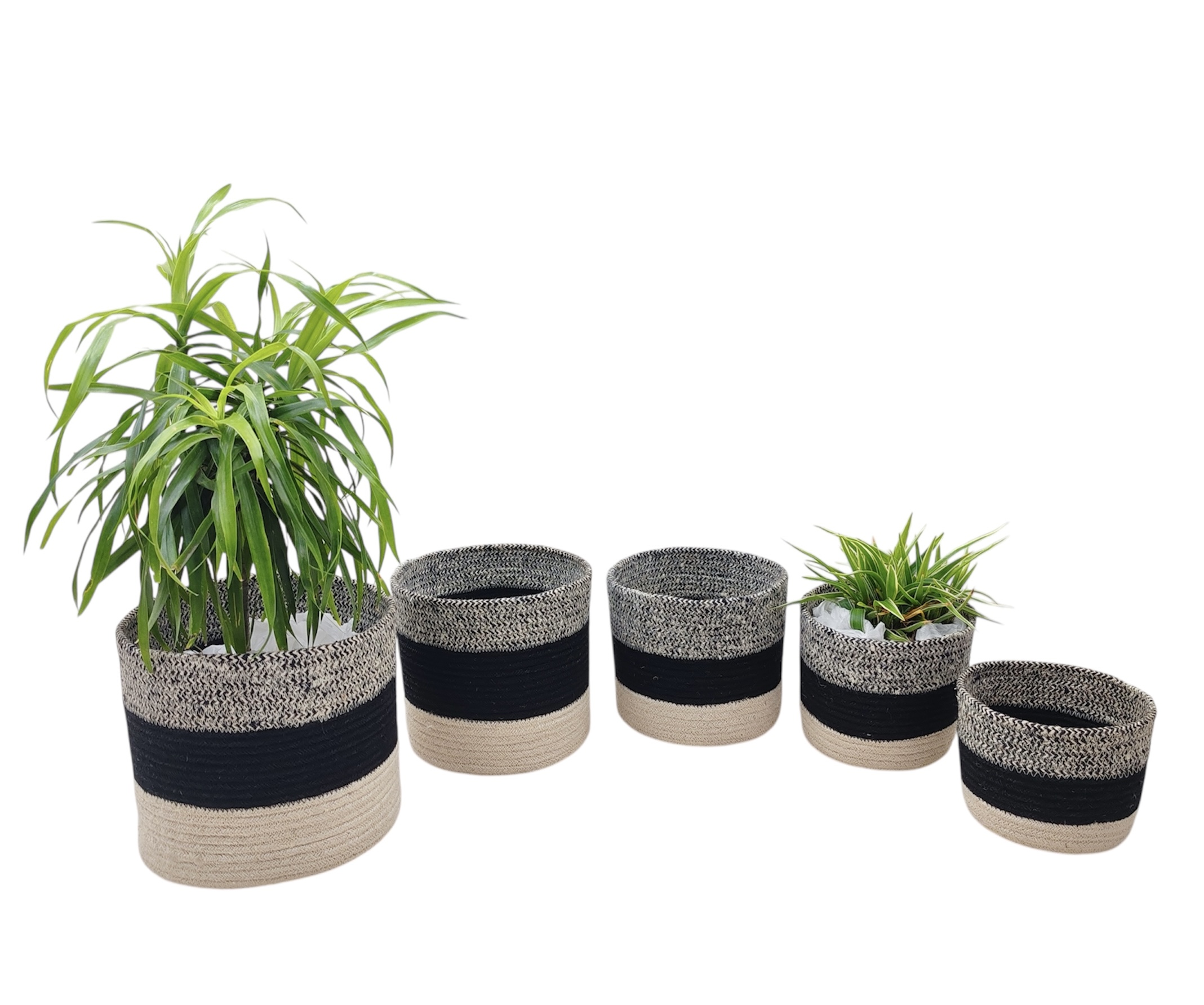 5-Piece Jute Planter Basket Set – Gray, Black & Natural Tricolor